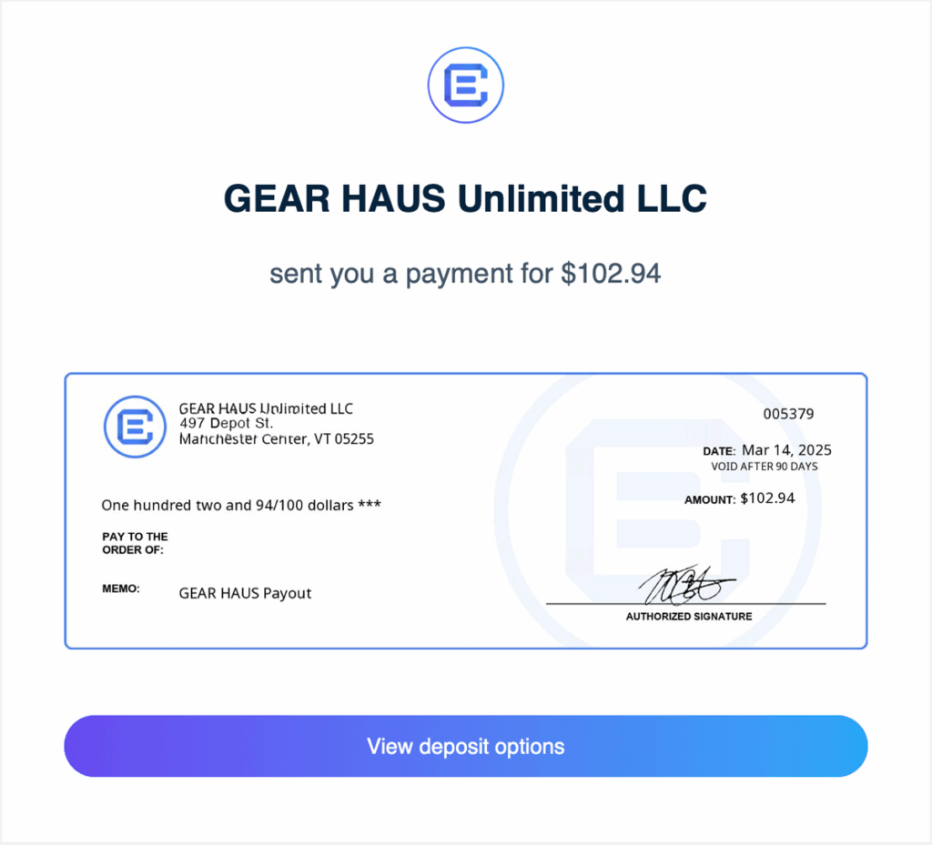 Payouts are sent on the 15th of each month. You will receive an email with an image of a digital check. Click the button labeled “View deposit options” and follow the prompts. Payment options include printing a check to deposit remotely or at your local bank or you can select to have your payment deposited electronically via ACH.